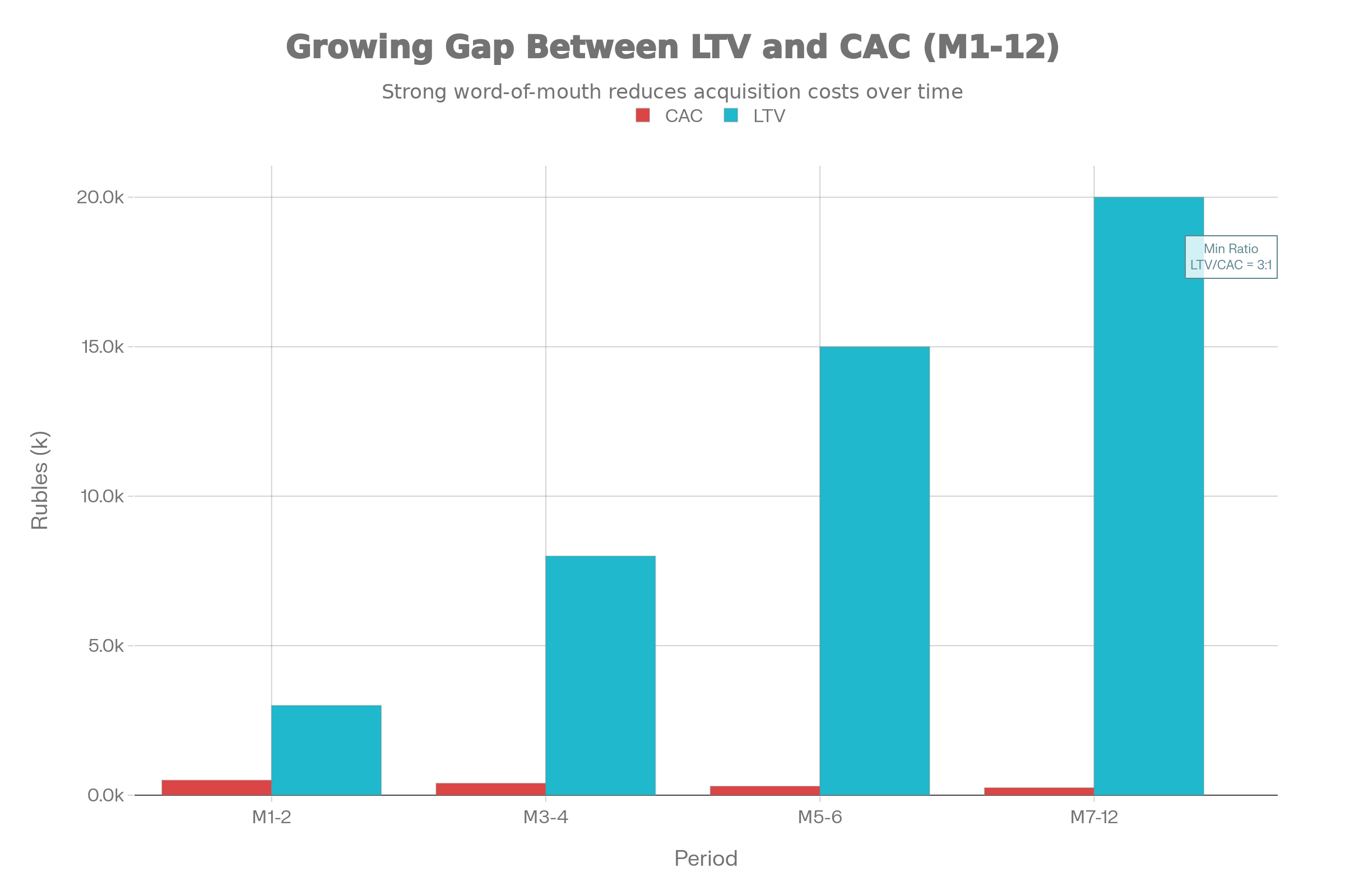 Интерпретация: Вы платите 250 рублей, чтобы привлечь клиента, который в итоге приносит 20,000 рублей прибыли. Это здоровая экономика.