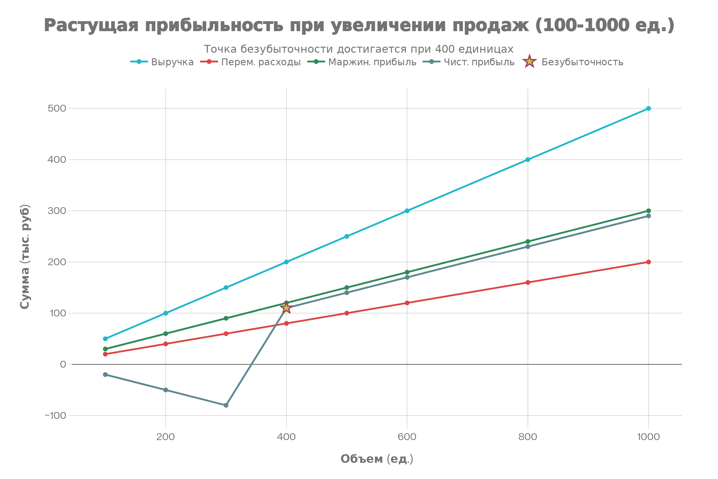 Критическая точка: 350–380 единиц товара в месяц или ~175–190 тыс. рублей выручки в месяц.