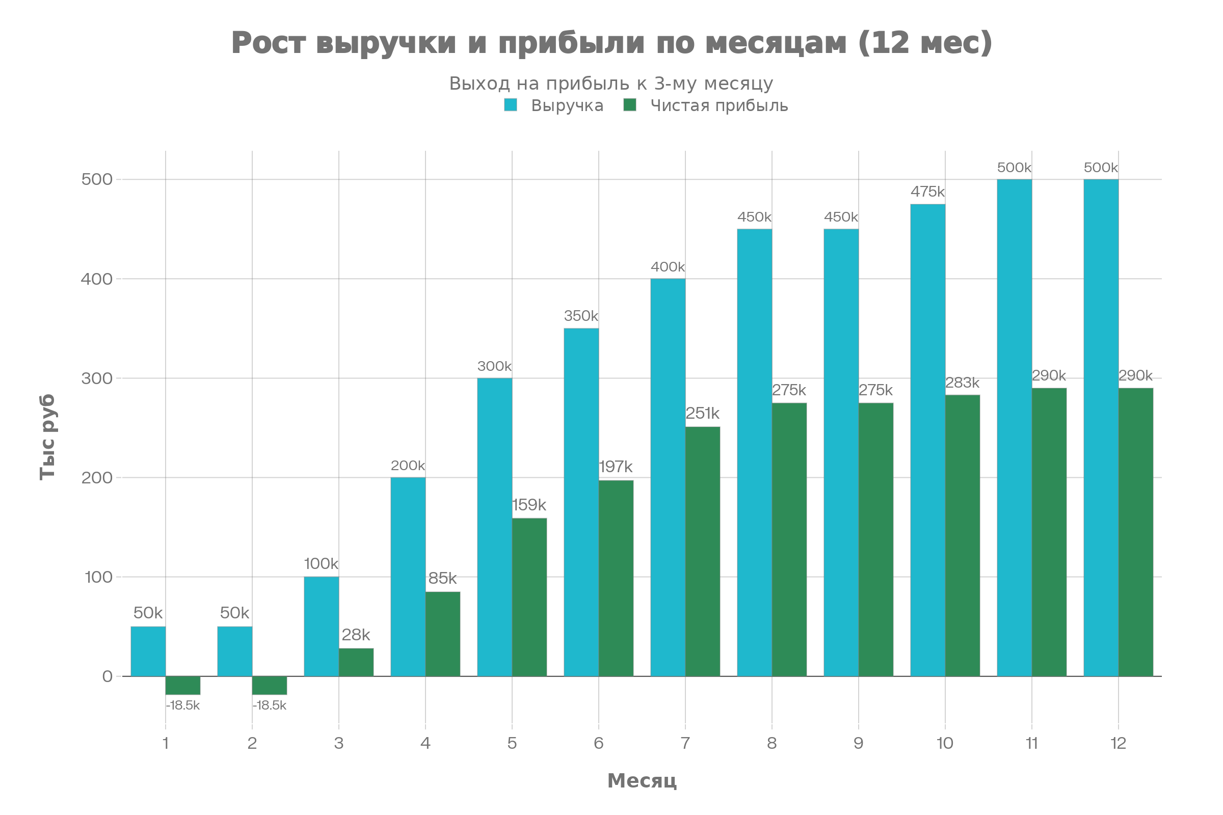 При таком объёме чистая прибыль переходит из красной зоны в зелёную. На практике эта точка достигается примерно в месяц 4–5.