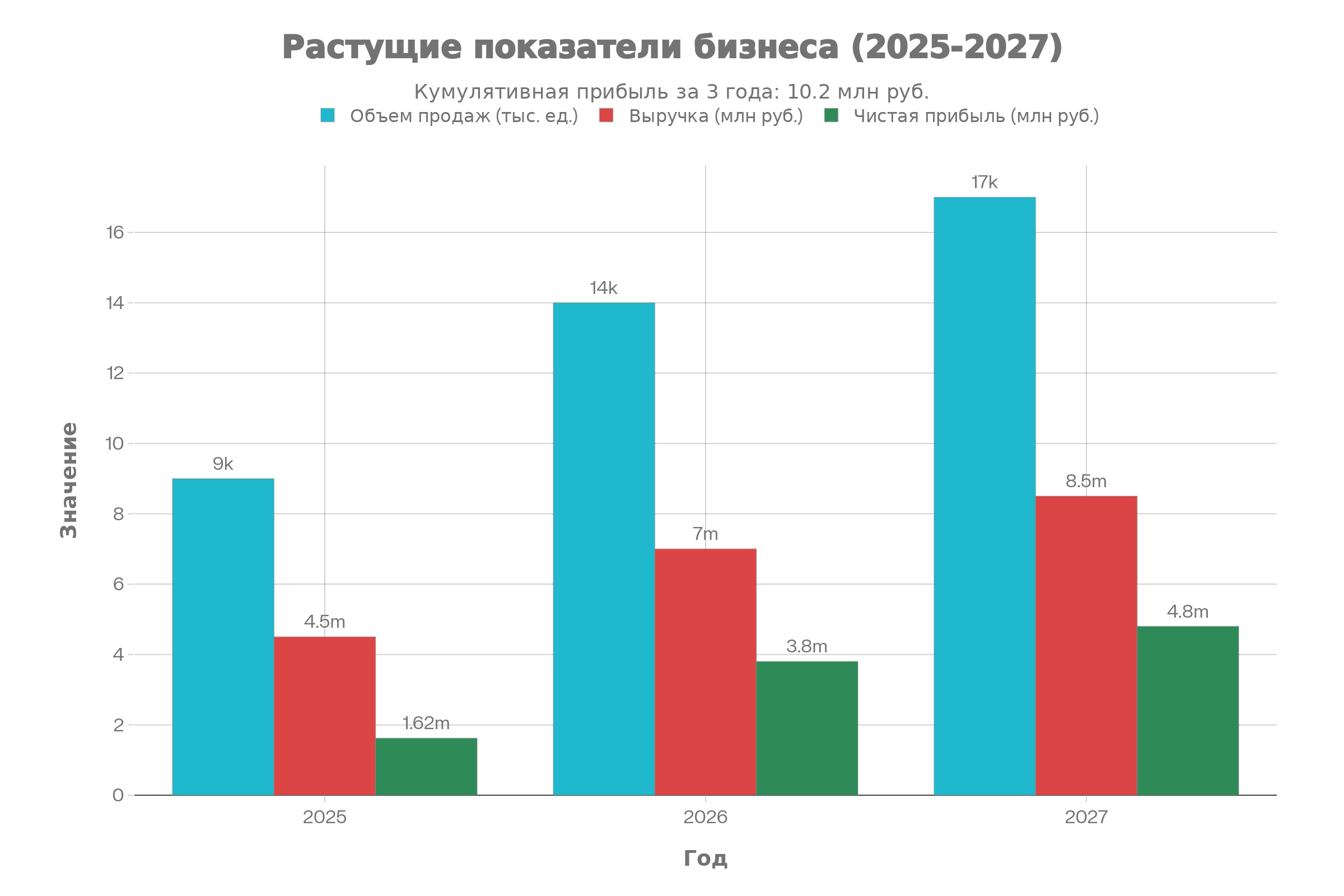 При дисциплинированном выполнении плана реалистично получить 1,6–1,9 млн рублей чистой прибыли в первый год и 4,8 млн в третий год.