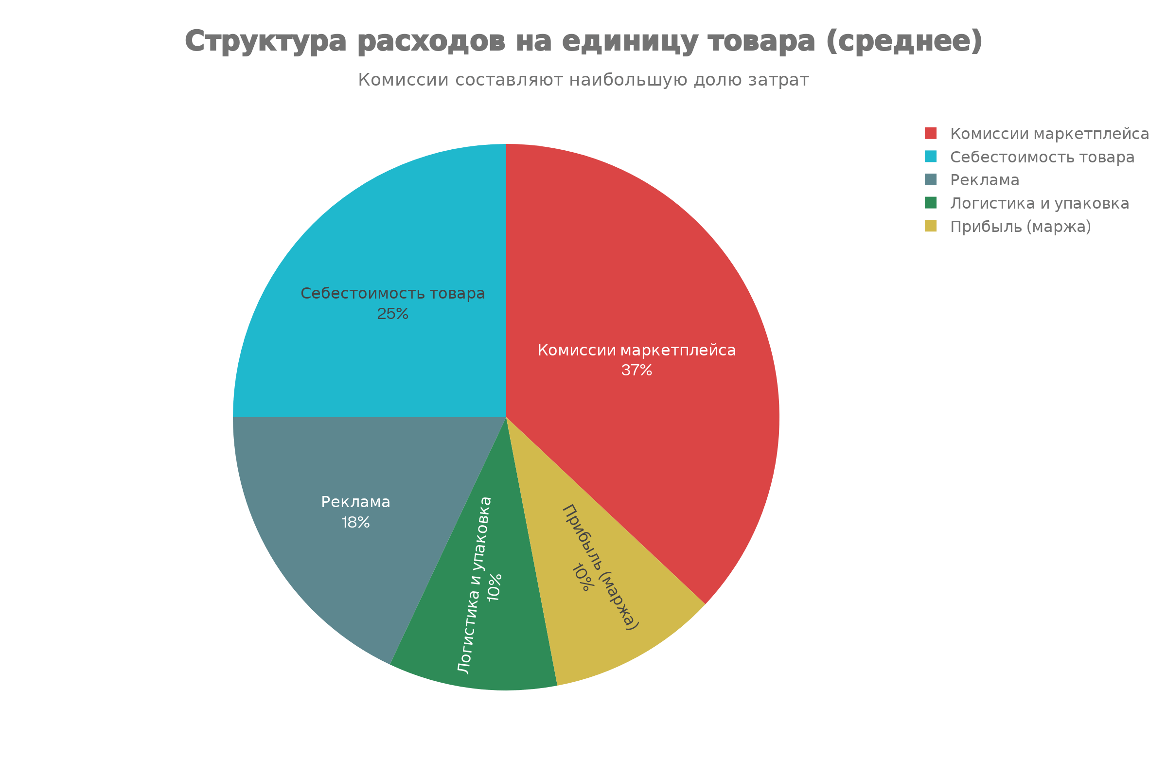 - Комиссии маркетплейсов: 35–37% от выручки (Wildberries 29,5–34,5% + эквайринг 1,5% + организация платежей 1,5%)